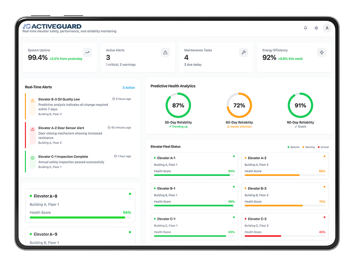 ActiveGuard combines patented field services with IoT-powered analytics to continuously monitor elevator health. Facilities teams gain real-time insight, leadership gains measurable assurance, and facilities gain safer, more reliable vertical transportation.
